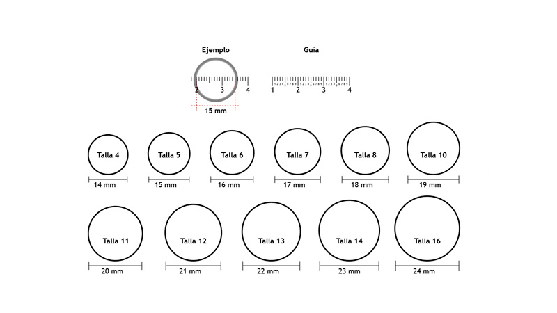Para poder determinar el tamaño de su sortija, debe tomar como referencia otro anillo, medir el diámetro interior en milímetros y comparar con esta tabla de tallas. Recuerde tomar como referencia el borde interno del anillo.