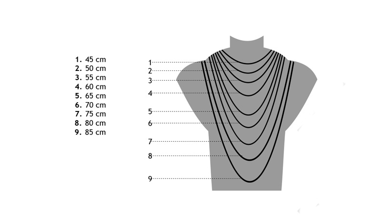 La talla del collar dependerá del tamaño que mejor se adapte a su look. El gráfico representa una visualización aproximada ya que el largo puede variar según la forma de su cuerpo. La talla más corta corresponde a los collares que se ajustan al cuello, no obstante, estos tienen argollas que permiten graduar la talla a su medida.
