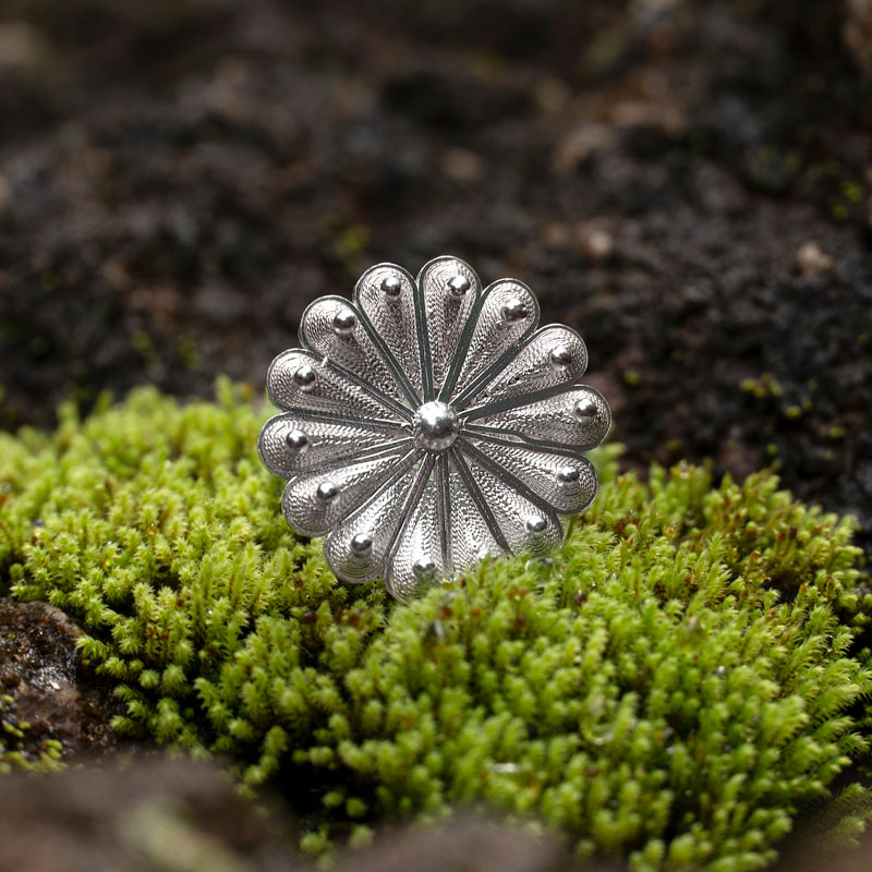 Anillo de flor en tejido halado repujado. Elaborado completamente a mano en plata ley 950 por artesanos de Mompós Bolívar. Un pedacito de cultura colombiana.