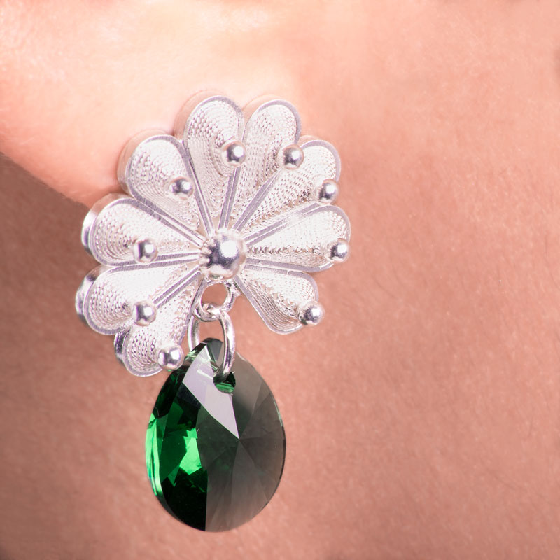 Par de aretes de flor en tejido halado repujado y cristales. Elaborados completamente a mano en plata ley 950 por artesanos de Mompós Bolívar. Un pedacito de cultura colombiana.