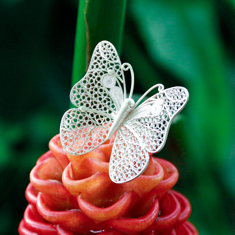 Anillo maxi inspirado en la mariposa Panacea Prola Amazónica. Elaborado completamente a mano en plata ley 950 por artesanos de Mompós Bolívar. Una auténtica representación del espíritu Momposino.