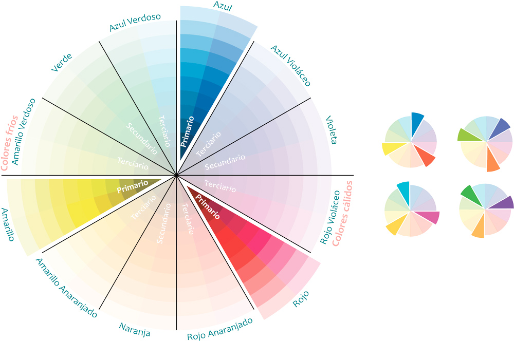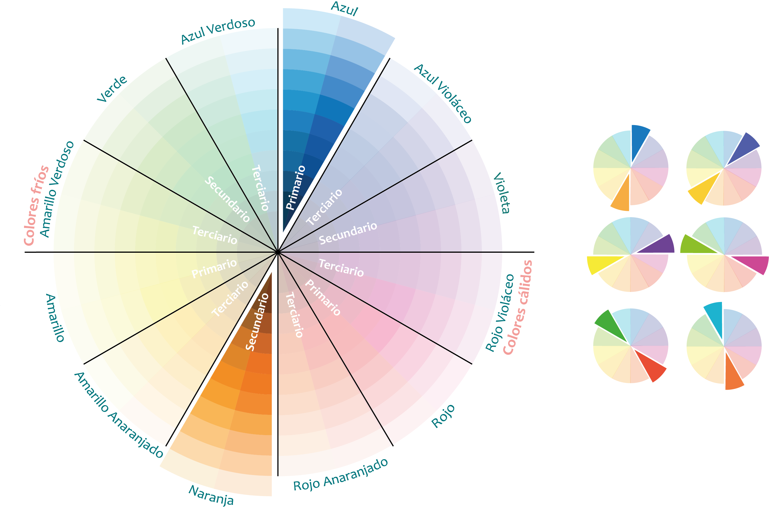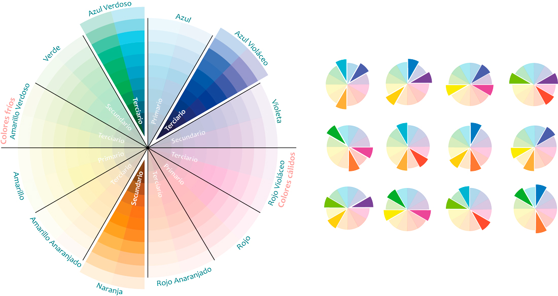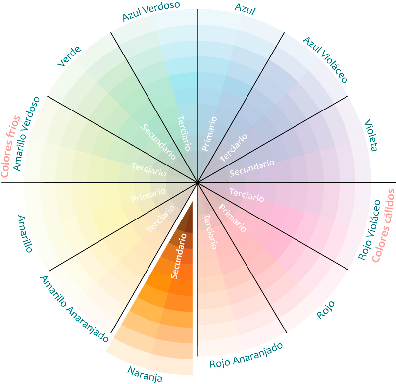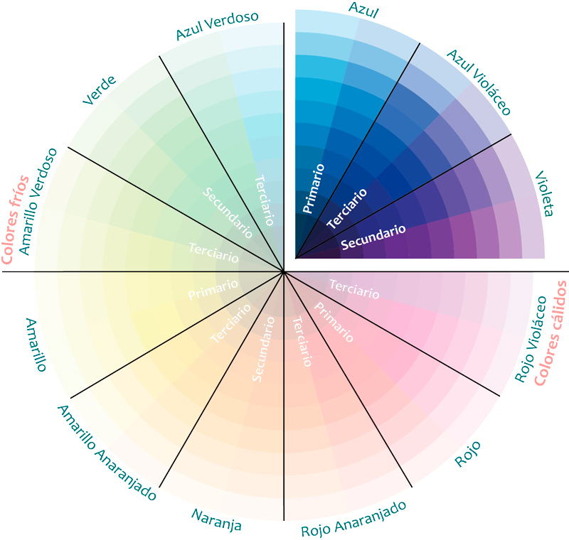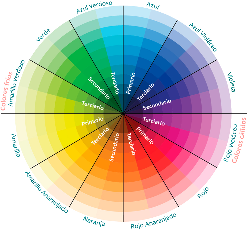 El círculo cromático, rueda de colores o disco cromático, representa de una forma circular y ordenada los colores de acuerdo con la posición que ocupan en el espectro de luz permitiéndonos conocer la armonía entre los colores primarios y sus derivados. Estos círculos cromáticos pueden representarse escalonados o en degradé segmentando los colores; púrpura, rojo, amarillo, verde, azul cian y azul oscuro. De estos seis colores principales se desprenden otros a partir de la variación de la intensidad y los tonos.