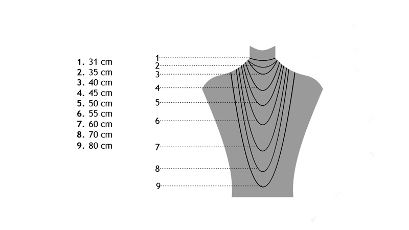 La talla del collar dependerá del tamaño que mejor se adapte a su look. El gráfico representa una visualización aproximada ya que el largo puede variar según la forma de su cuerpo. La talla más corta corresponde a los collares que se ajustan al cuello, no obstante, estos tienen argollas que permiten graduar la talla a su medida.