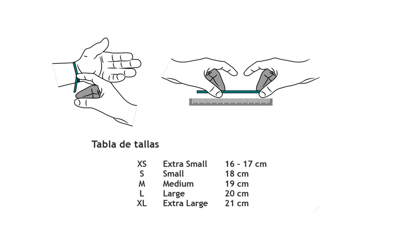 Tomando una cuerda, debe rodear su muñeca de forma precisa sin apretar, marque el punto donde se juntan los extremos al rodear su muñeca. Después, debe extender la cuerda sobre una regla desde la punta hasta donde marcó el punto donde se juntan. Entonces puede identificar su talla en la siguiente tabla.